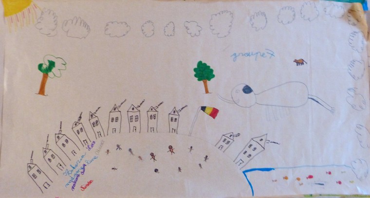 Les voici, par petits groupes inter-classes, penchés sur leurs marqueurs et leurs idées. La négociation est intense : il faut se mettre d’accord sur une vision du monde. Certaines groupes dessinent d’abord et ensuite expliquent et retouchent. D’autres raisonnent âprement devant la feuille vierge. Finalement, chaque groupe présente son travail. Le résultat, dessins et commentaires, est très parlant et mériterait une étude en soi. En voici, ci-dessous, quelques échos.