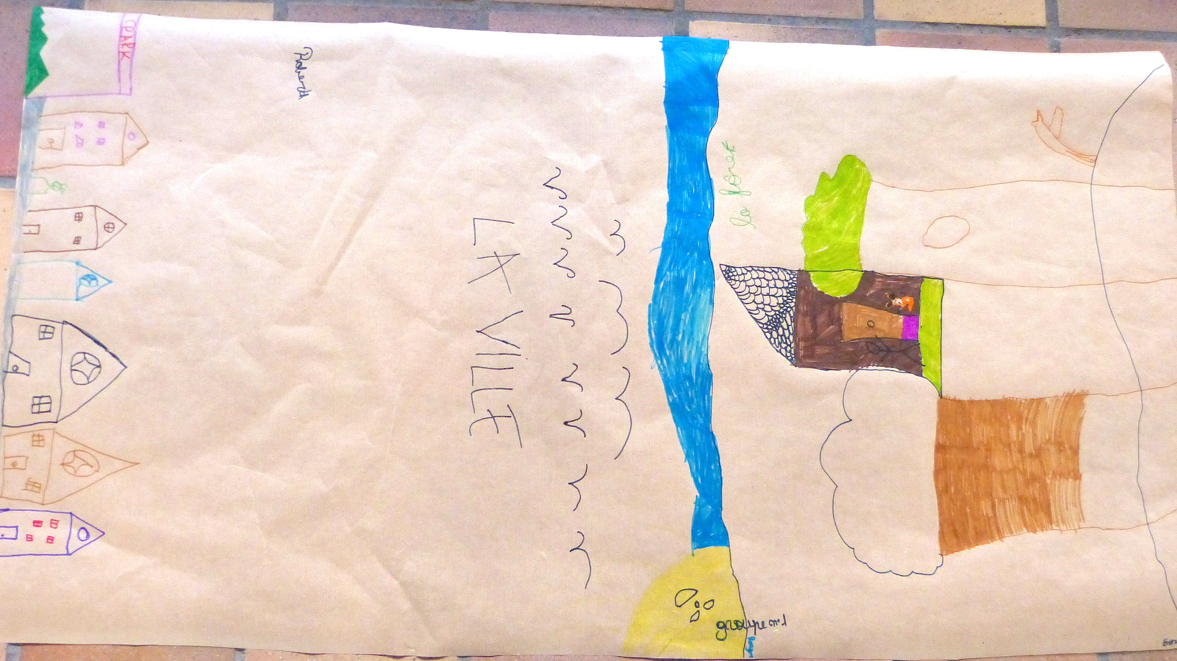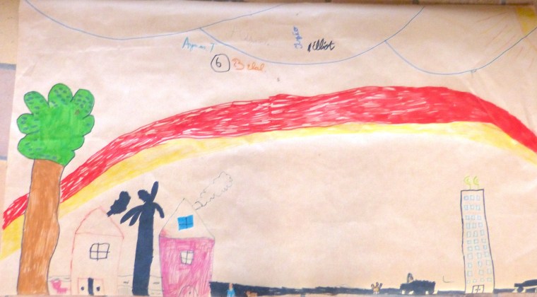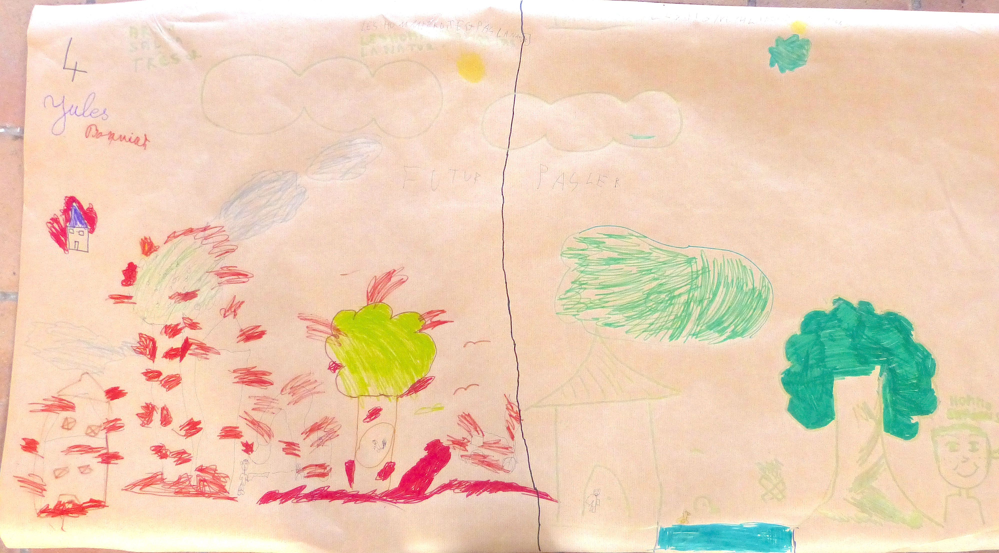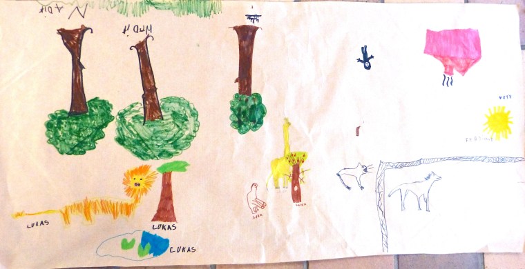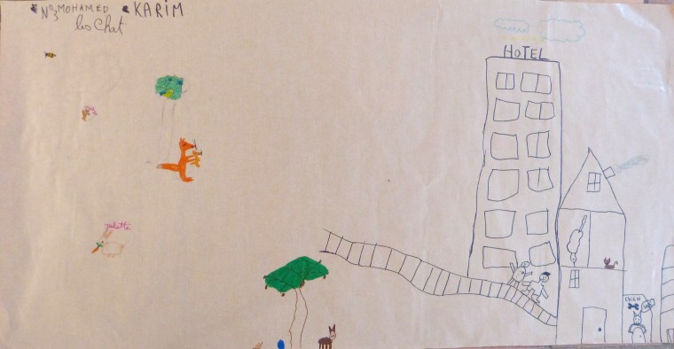 Le monde, c’est la carte de géographie. En même temps, les « pays », c’est chez les humains. La nature, c’est forcément en dehors – ici, même en dehors de la planète.Vision très noire de l’histoire humaine : le passé, à gauche, est tout en verdure et en paix. A gauche, la forêt en flamme, « c’est le futur, c’est nous, c’est maintenant. On détruit tout. »Dans ce groupe, on a placé « l’humain partout, et les animaux partout, et la nature partout. C’est normal, c’est partout ». Pas de frontière imperméable donc.Message identique ici ; seulement, l’humain se taille la part du lion. Intéressant de noter la petite carte de géographie et la mention des singes, comme si ces derniers avaient, eux aussi, leur pays propre.C’est l’homme préhistorique, idéalisé, qui est mis en scène ici, avec un feu, une grotte et divers éléments de paysage. « Comme au début du monde ». Adam ou Lucy ? Peu importe. Le tableau baigne dans la nostalgie d’un passé perçu comme forcément plus harmonieux.Un arc-en-ciel enjambe une scène fort bétonnée de la vie quotidienne. Où est la nature ? « C’est l’arbre, là, sur le côté ». Comme à Bruxelles, elle est sagement là où on l’a plantée.Message identique ici : l’autoroute prend toute la place et les arbres semblent bien misérables.Ils étaient six dans le groupe (tout autour de la feuille), voici donc un monde partagé en six : une part pour les humains (en haut à droite), une autre pour les animaux domestiques (en bas, à gauche, derrière leur barrière) et le reste pour la nature. « Plus on va par là, plus c’est sauvage ». D’ailleurs, il y a un lion.