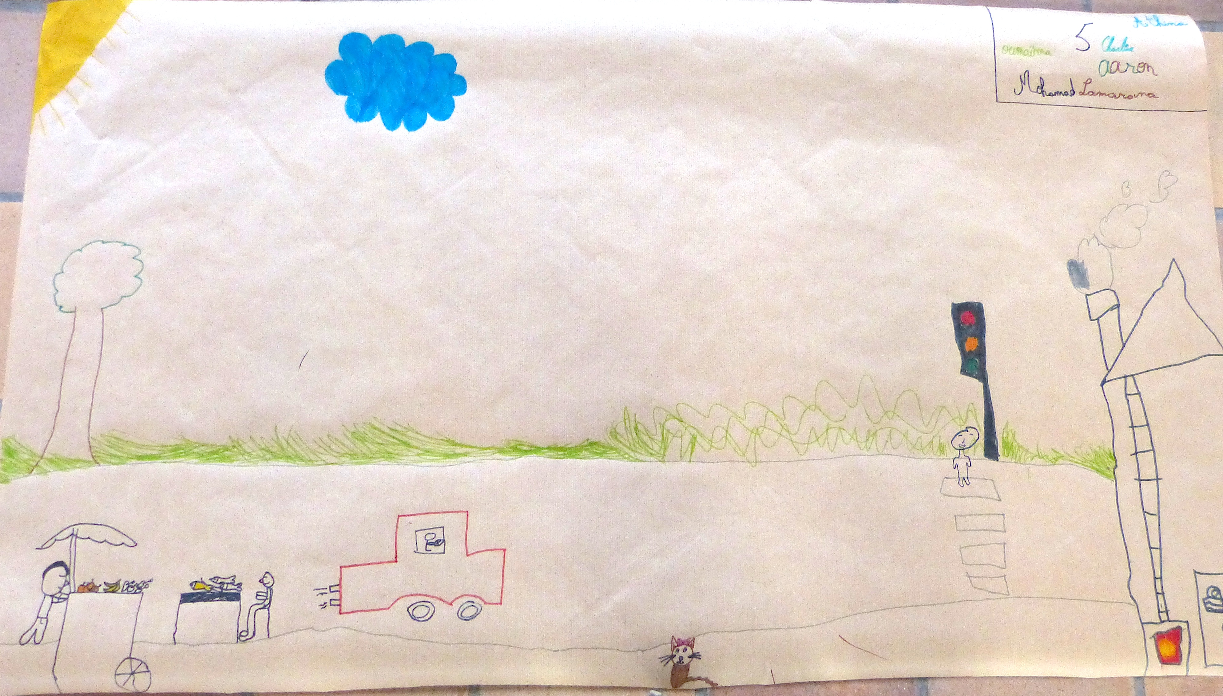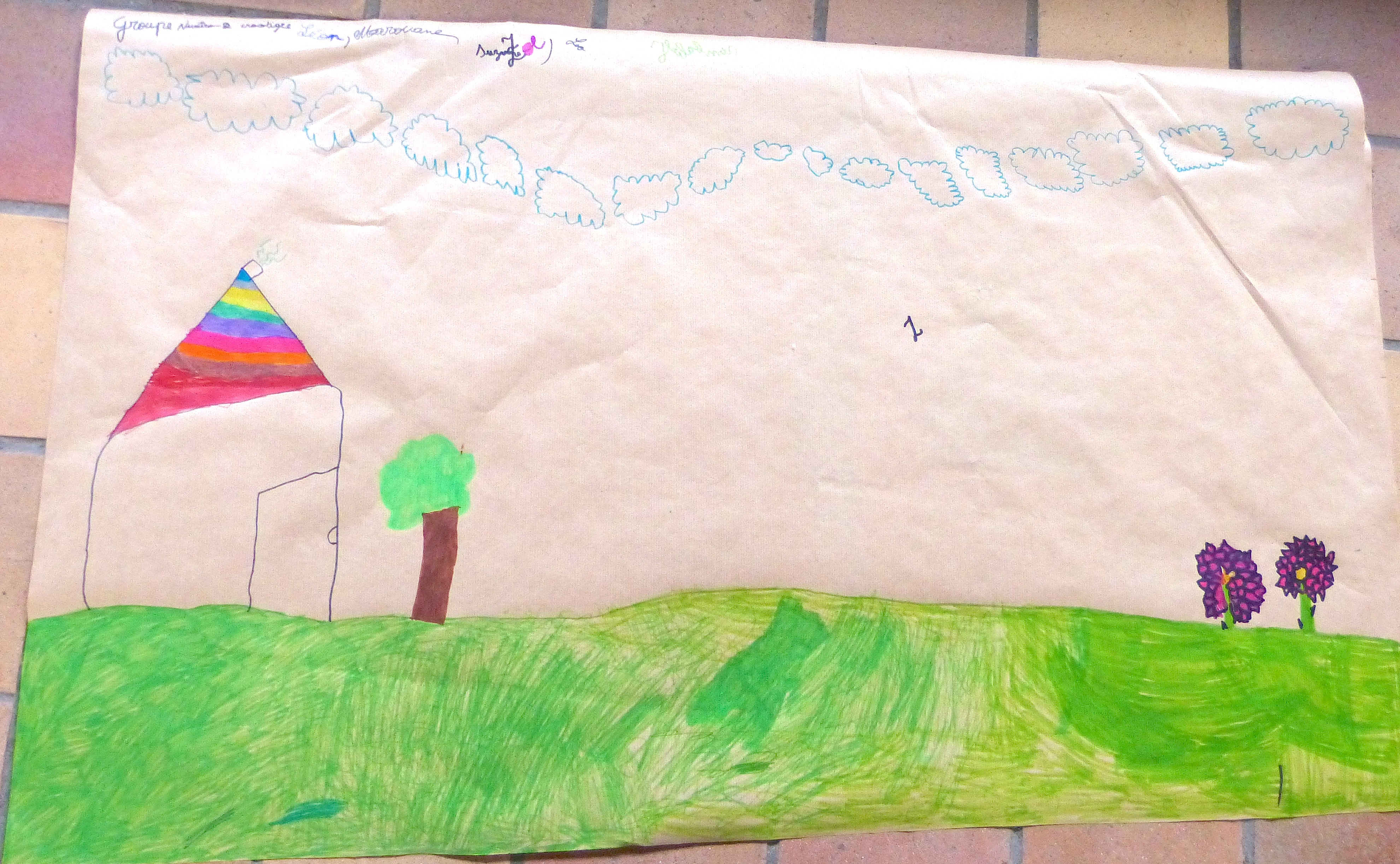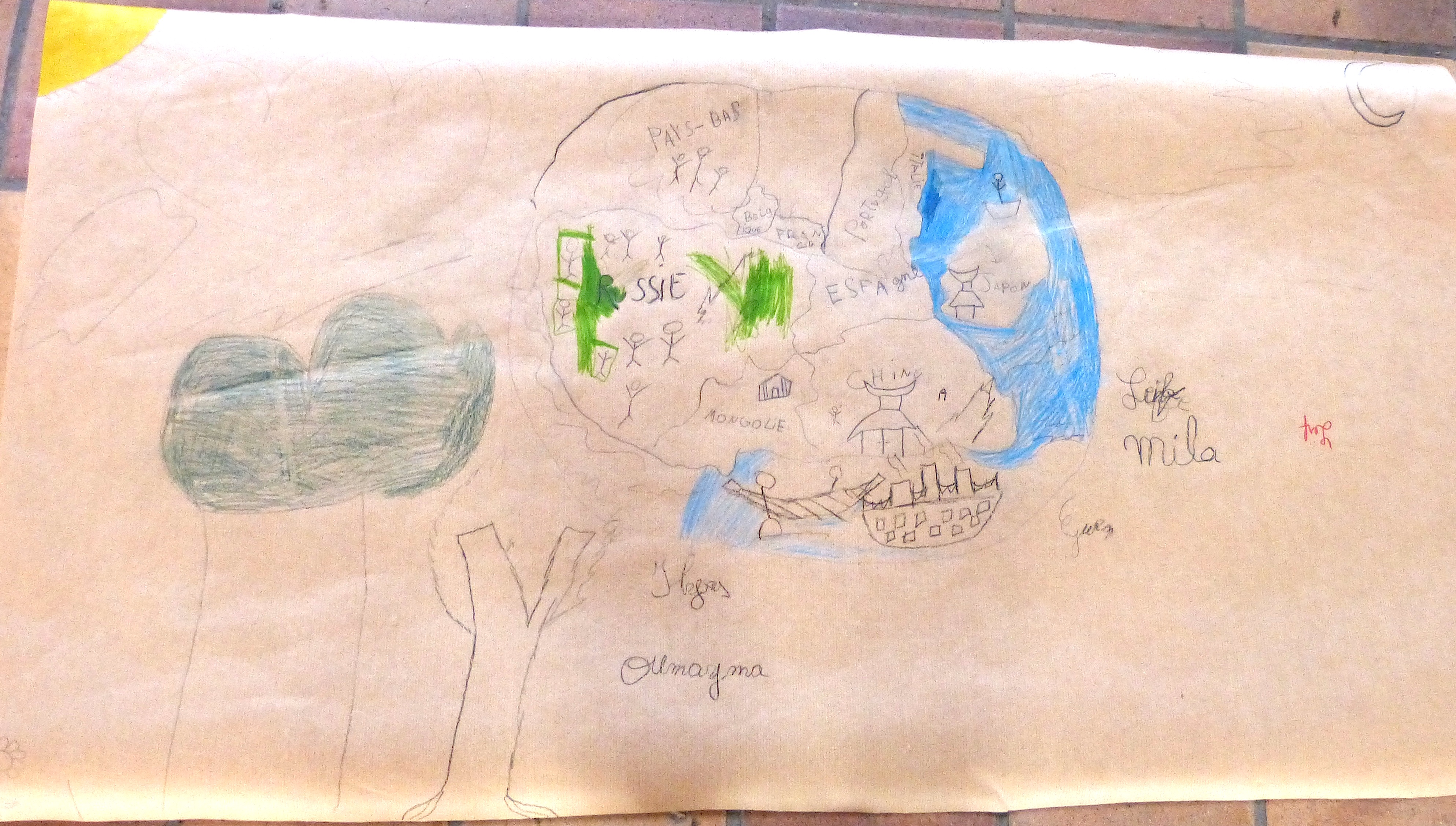 Le monde, c’est la carte de géographie. En même temps, les « pays », c’est chez les humains. La nature, c’est forcément en dehors – ici, même en dehors de la planète.Vision très noire de l’histoire humaine : le passé, à gauche, est tout en verdure et en paix. A gauche, la forêt en flamme, « c’est le futur, c’est nous, c’est maintenant. On détruit tout. »Dans ce groupe, on a placé « l’humain partout, et les animaux partout, et la nature partout. C’est normal, c’est partout ». Pas de frontière imperméable donc.Message identique ici ; seulement, l’humain se taille la part du lion. Intéressant de noter la petite carte de géographie et la mention des singes, comme si ces derniers avaient, eux aussi, leur pays propre.C’est l’homme préhistorique, idéalisé, qui est mis en scène ici, avec un feu, une grotte et divers éléments de paysage. « Comme au début du monde ». Adam ou Lucy ? Peu importe. Le tableau baigne dans la nostalgie d’un passé perçu comme forcément plus harmonieux.Un arc-en-ciel enjambe une scène fort bétonnée de la vie quotidienne. Où est la nature ? « C’est l’arbre, là, sur le côté ». Comme à Bruxelles, elle est sagement là où on l’a plantée.Message identique ici : l’autoroute prend toute la place et les arbres semblent bien misérables.Ils étaient six dans le groupe (tout autour de la feuille), voici donc un monde partagé en six : une part pour les humains (en haut à droite), une autre pour les animaux domestiques (en bas, à gauche, derrière leur barrière) et le reste pour la nature. « Plus on va par là, plus c’est sauvage ». D’ailleurs, il y a un lion.