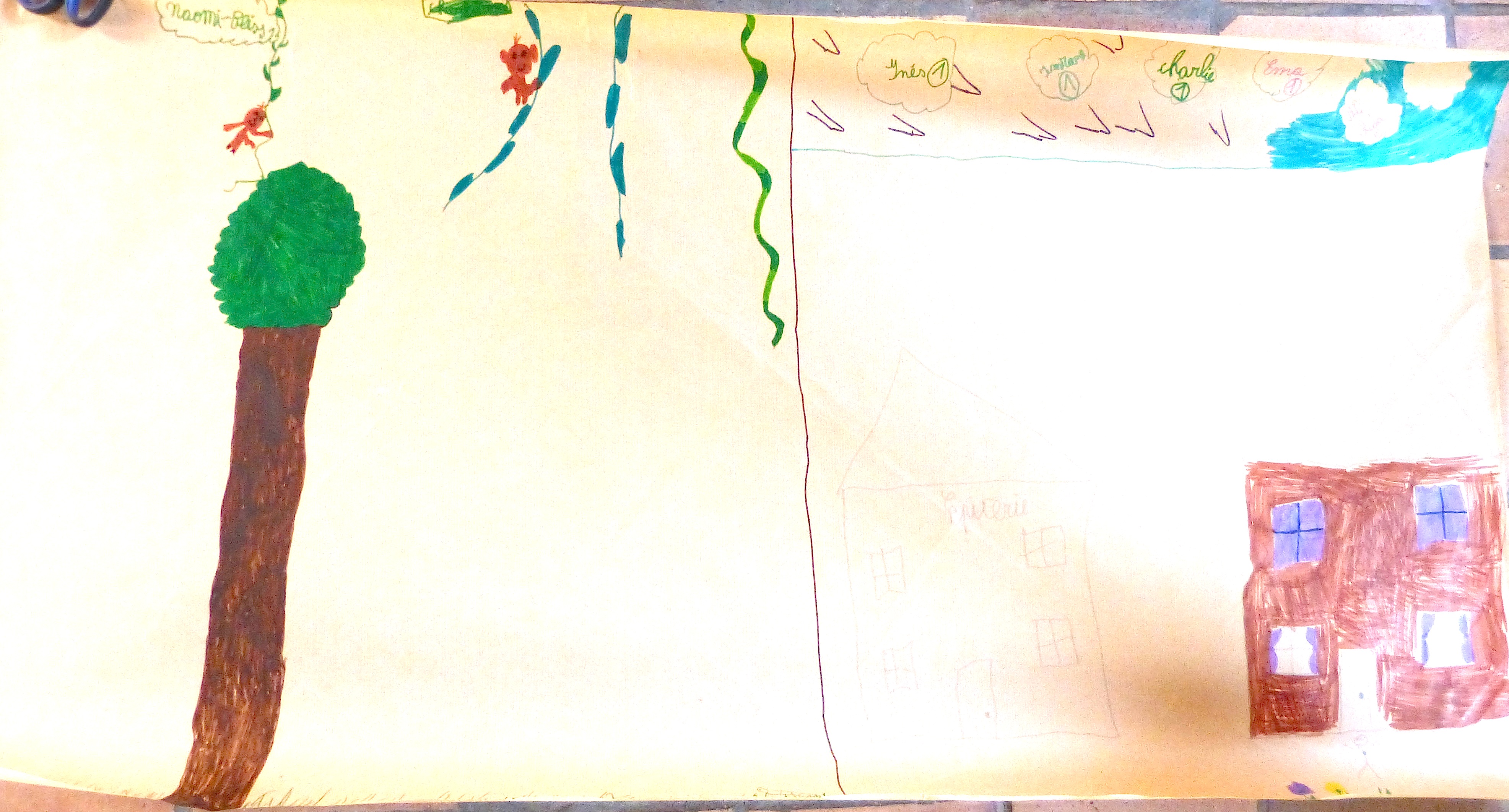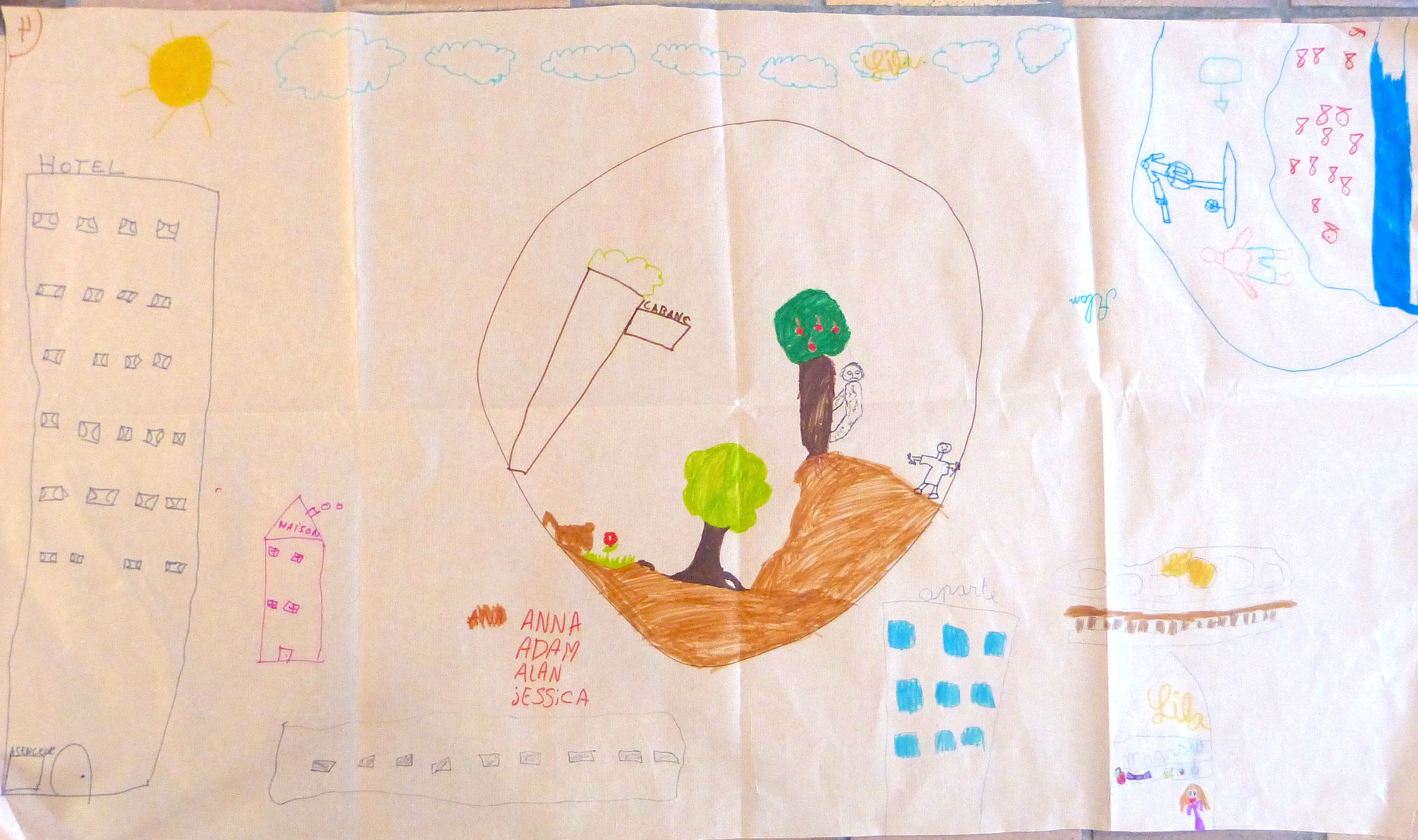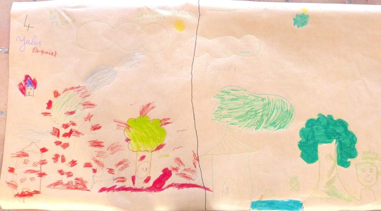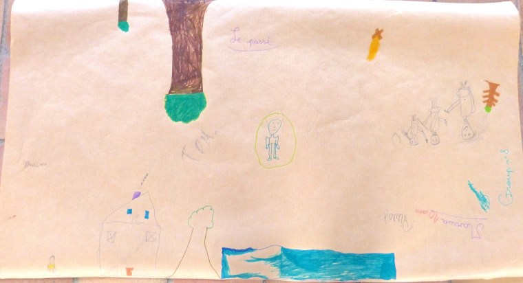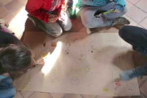 L’heure est ensuite au dessin. On leur demande de mettre, sur un grand poster, les principaux « ingrédients » nécessaires pour « faire un monde » et, tant qu’à faire, d’y inscrire l’Humain à sa « juste » place. Les mots sont volontairement vagues pour éviter de trop orienter leur réflexion.