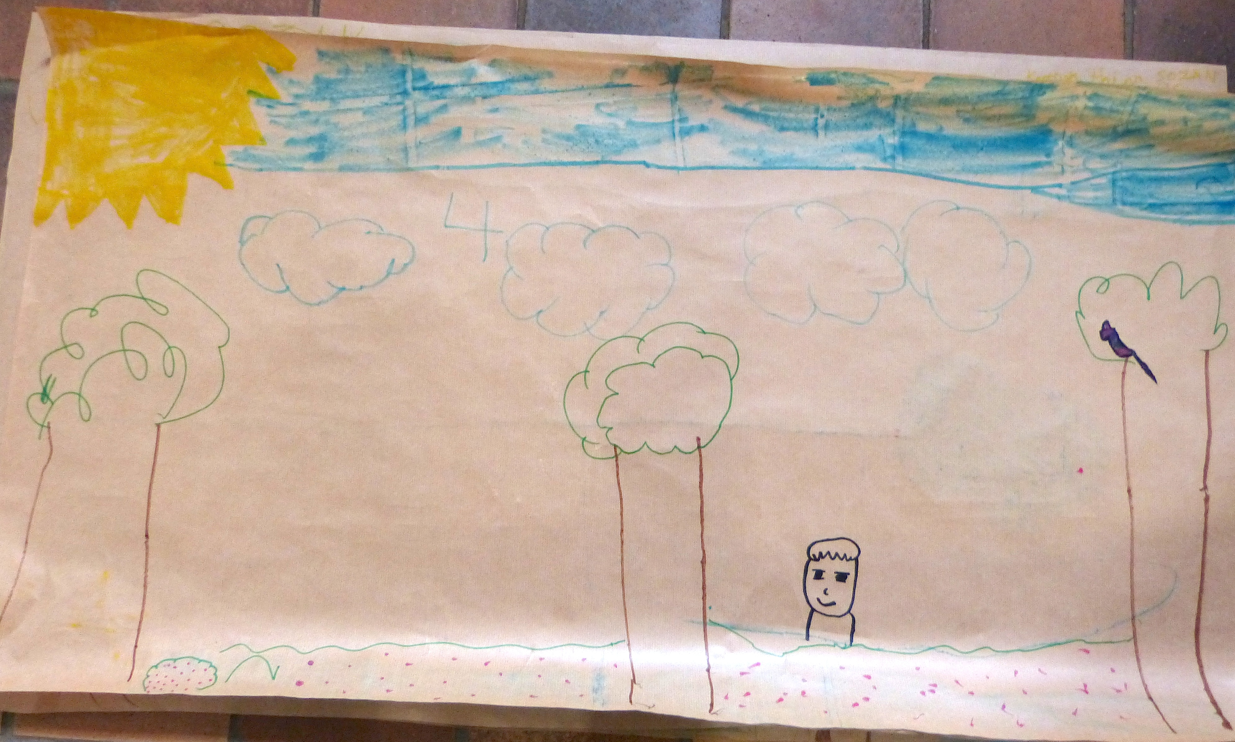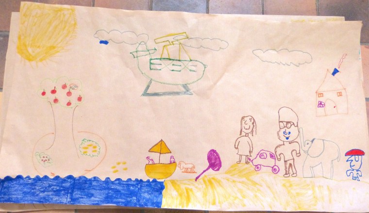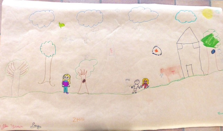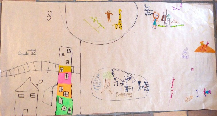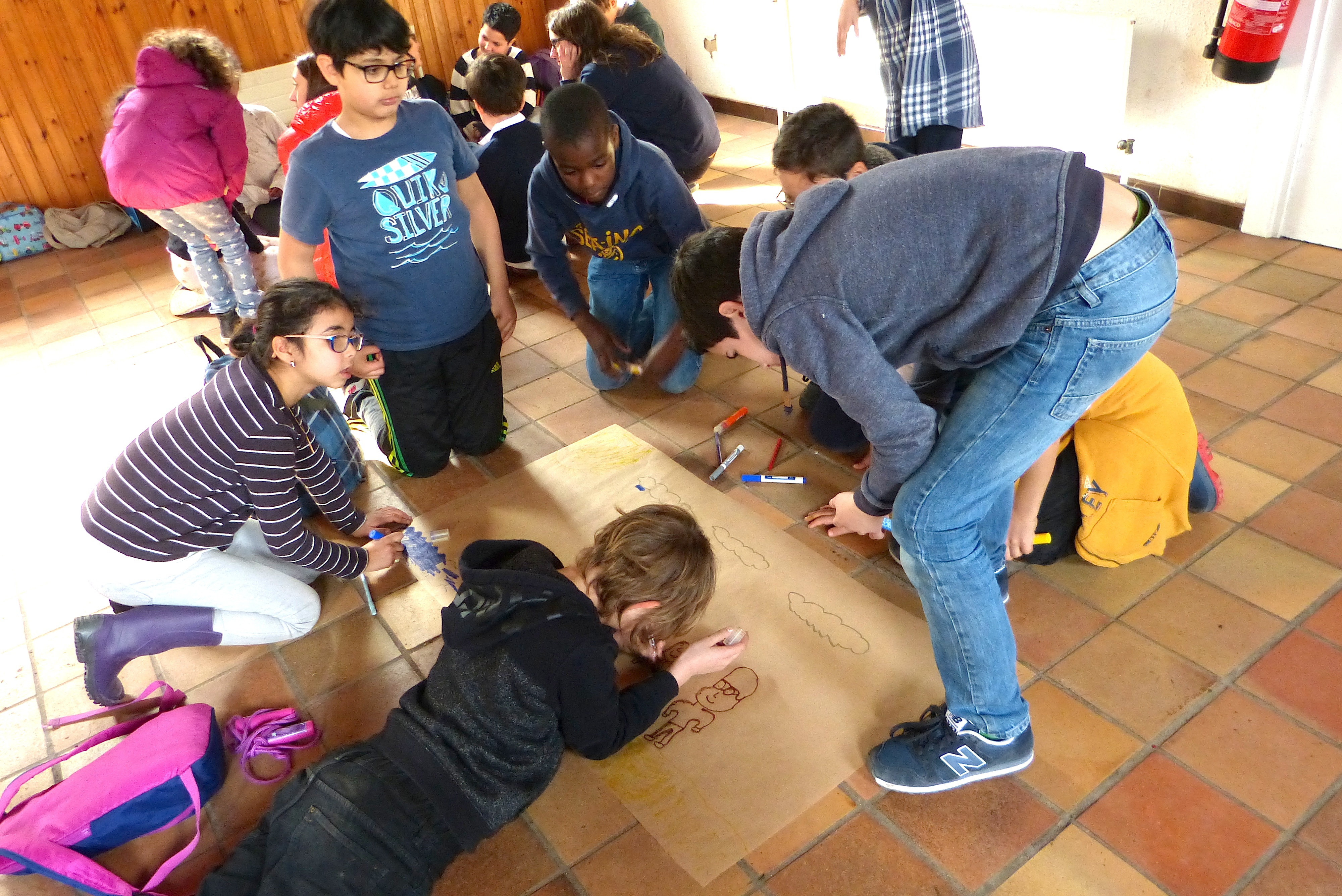 L’heure est ensuite au dessin. On leur demande de mettre, sur un grand poster, les principaux « ingrédients » nécessaires pour « faire un monde » et, tant qu’à faire, d’y inscrire l’Humain à sa « juste » place. Les mots sont volontairement vagues pour éviter de trop orienter leur réflexion.
