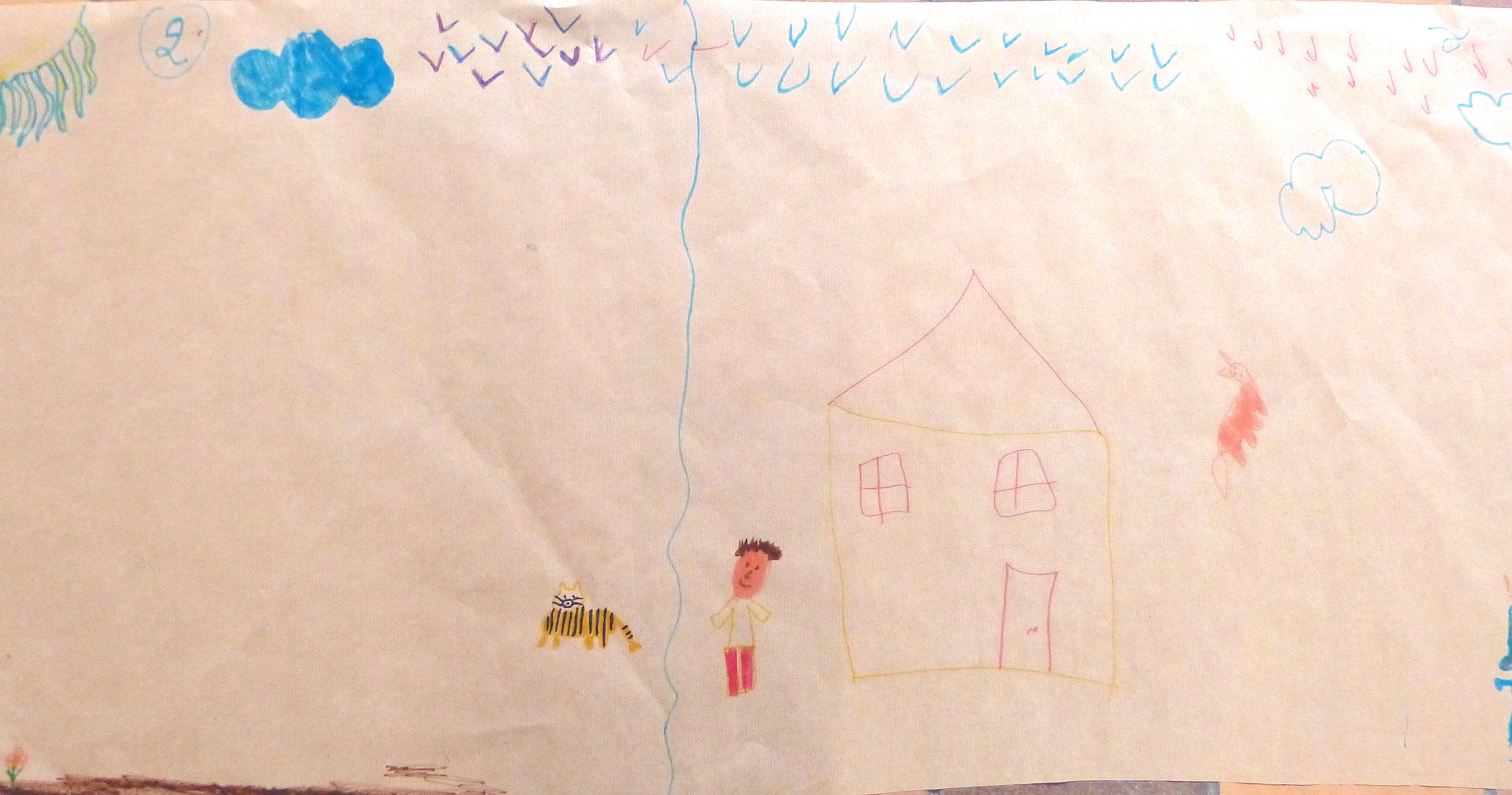 Un dessin très argumenté : « l’humain fait des hélicoptères et des bateaux, grâce auxquels il accède à des denrées (ici, les pommes) que certains animaux n’atteindront pas. Il habite dans une maison, pas dans un arbre. Et s’il domestique le cochon (en rose, entre l’homme et la femme), le cochon ne domestique pas l’humain ».« Monde » est ici synonyme de l’univers. Grosse discussion dans le groupe entre « géocentristes » (« on met la Terre au milieu! ») et héliocentristes (« non ! elle tourne autour du soleil »). L’humain occupe certes toute la Terre (et, sur l’image, il est même en route pour coloniser le soleil), mais qu’est-ce face à l’univers ?Le monde semble ici très compartimenté entre « ville » (en bas, à gauche) et « nature » (en haut, à droite). A signaler : les « Indiens d’Amérique », en bleu, dans un cercle, et l’Afrique », en haut : plus proches de la « nature » parce qu’ils « chassent, tuent et mangent des animaux ». Interrogés sur notre propre consommation de viande, les enfants cherchent confusément leurs mots : le lien entre viande et animaux n’est pas simple à exprimer.Impossible de rendre plus clairement la frontière entre « ville » et « nature » ressentie par ces jeunes Bruxellois. Ici, même le ciel est divisé.Même idée, tout aussi nette, de séparation. Dans ce monde-ci, par contre, les humains peuplent quand même la nature et l’on distingue un peu de verdure en ville.