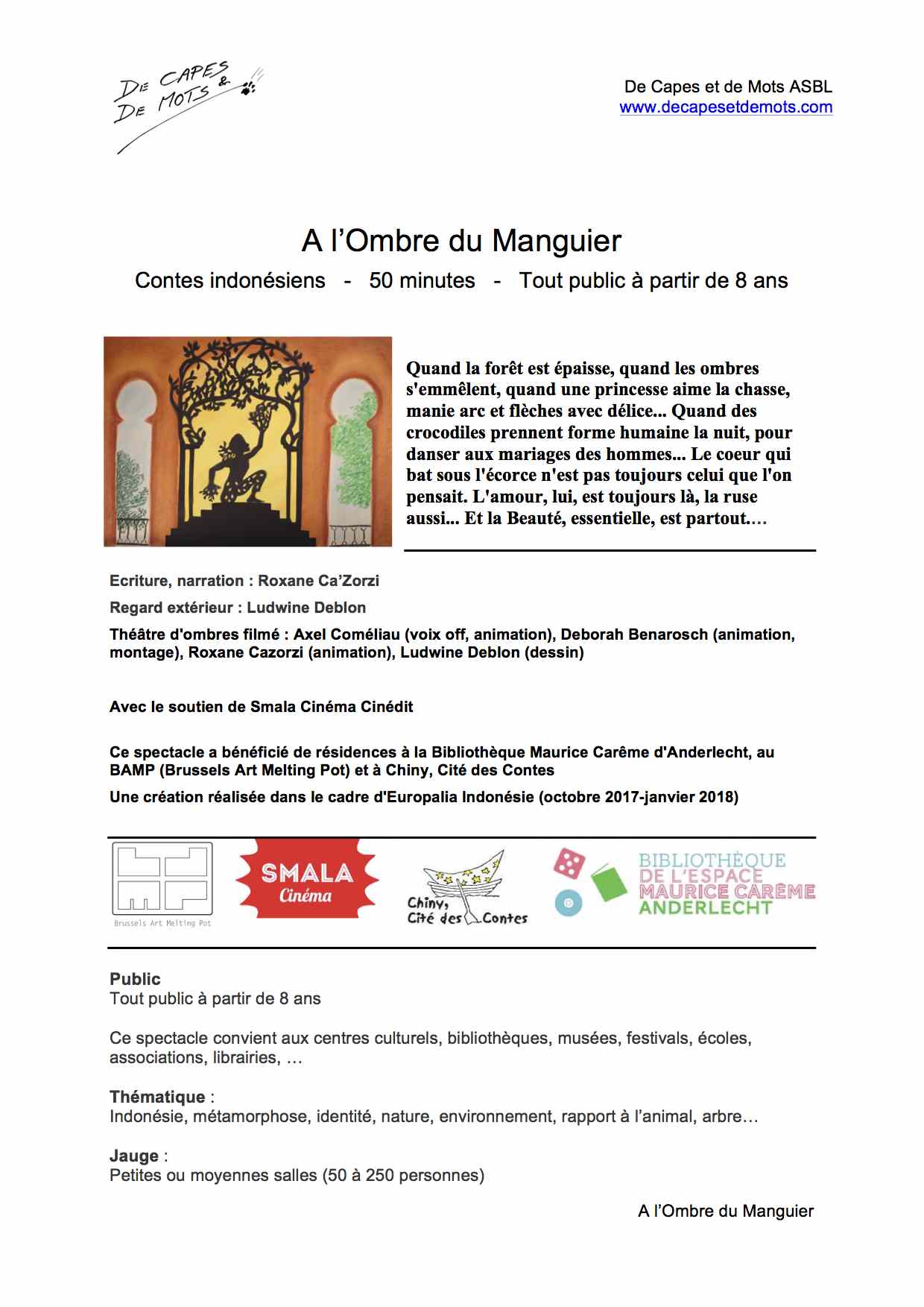 | Narration et écriture : Roxane Ca’Zorzi Regard extérieur : Ludwine Deblon Théâtre d’ombres filmé : Axel Coméliau (voix off, animation), Deborah Benarosch (animation, montage), Roxane Cazorzi (animation), Ludwine Deblon (dessin), avec le soutien de Cinédit Ce spectacle a bénéficié de résidences à la Bibliothèque Maurice Carême d’Anderlecht, au BAMP (Brussels Art Melting Pot) et à Chiny, Cité des Contes Une création réalisée dans le cadre d’Europalia Indonésie (octobre 2017-janvier 2018) |