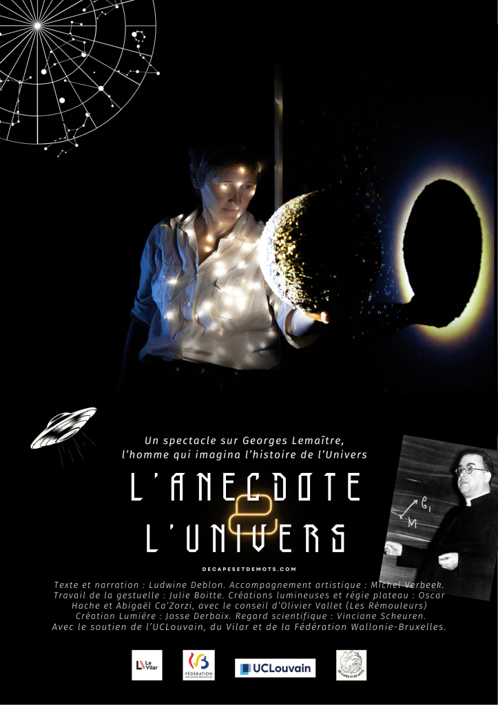 Texte et narration : Ludwine Deblon. Accompagnement artistique : Michel Verbeek. Travail de la gestuelle : Julie Boitte. Créations lumineuses et régie plateau : Oscar Hache et Abigaël Ca’Zorzi, avec le conseil d’Olivier Vallet (Les Rémouleurs) Création Lumière : Josse Derbaix. Regard scientifique : Vinciane Scheuren. Avec le soutien de l’UCLouvain, du Vilar et de la Fédération Wallonie-Bruxelles. Nous remercions Vinciane Scheuren, Jan Govaerts, Véronique Filieux et Frédéric Blondeau (UCLouvain), David Zazurca (La Rosée) ainsi que toute l’équipe du Vilar pour leur chaleureux accueil. Ce spectacle a été créé dans le cadre des 600 ans de l’UCLouvain, où a enseigné Georges Lemaître (2025).