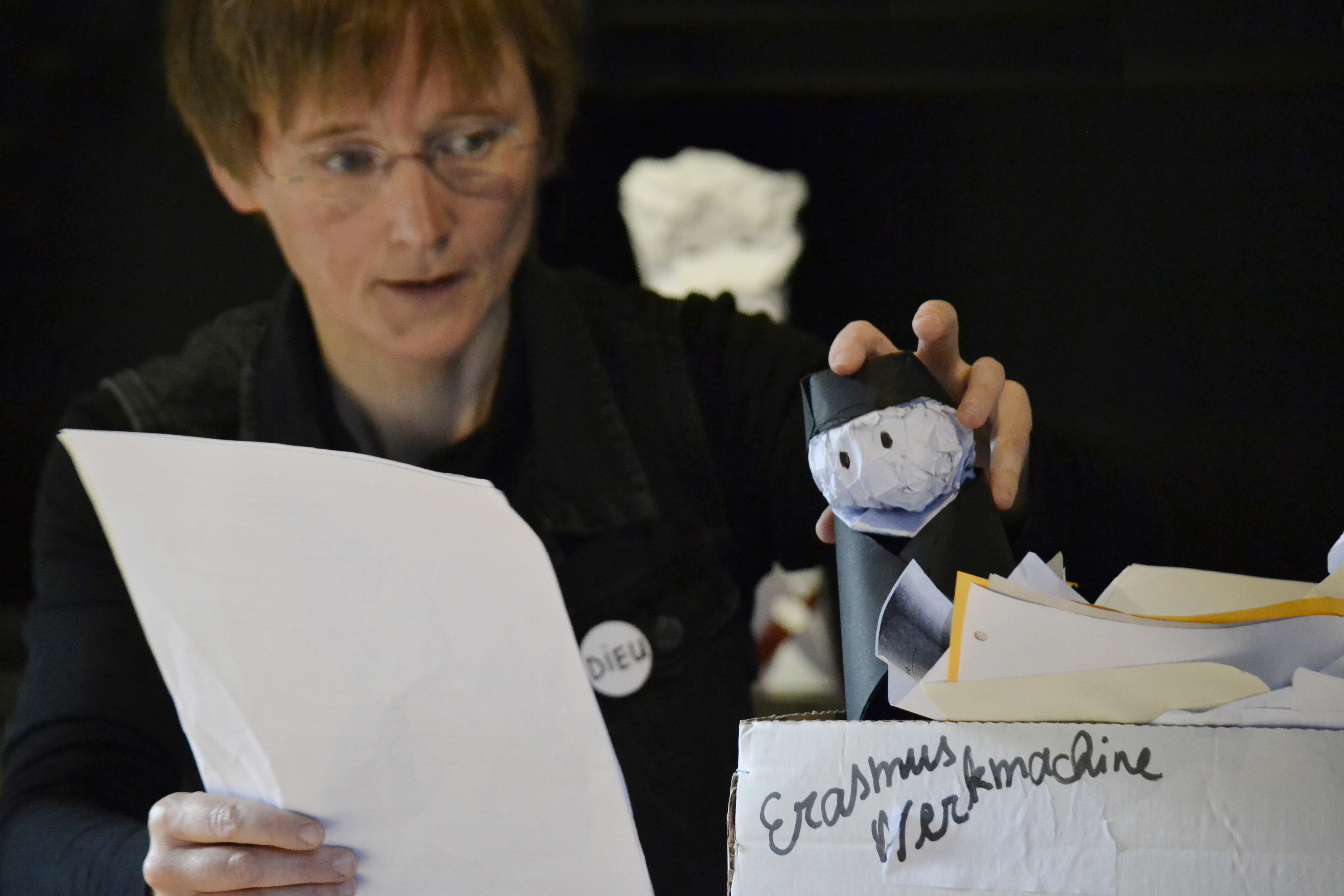 Ce théâtre d’objets parfaitement irrévérencieux a été créé en 2014 à la Maison d’Erasme à Anderlecht. Sa version en néerlandais a suivi 15 mois plus tard. Depuis, ce spectacle y est hébergé en permanence et figure dans le catalogue d’activités pour groupes. « Erasme » a également été présenté à l’Écomusée en Véron, en juillet 2017, dans le cadre d’un festival autour de Rabelais.