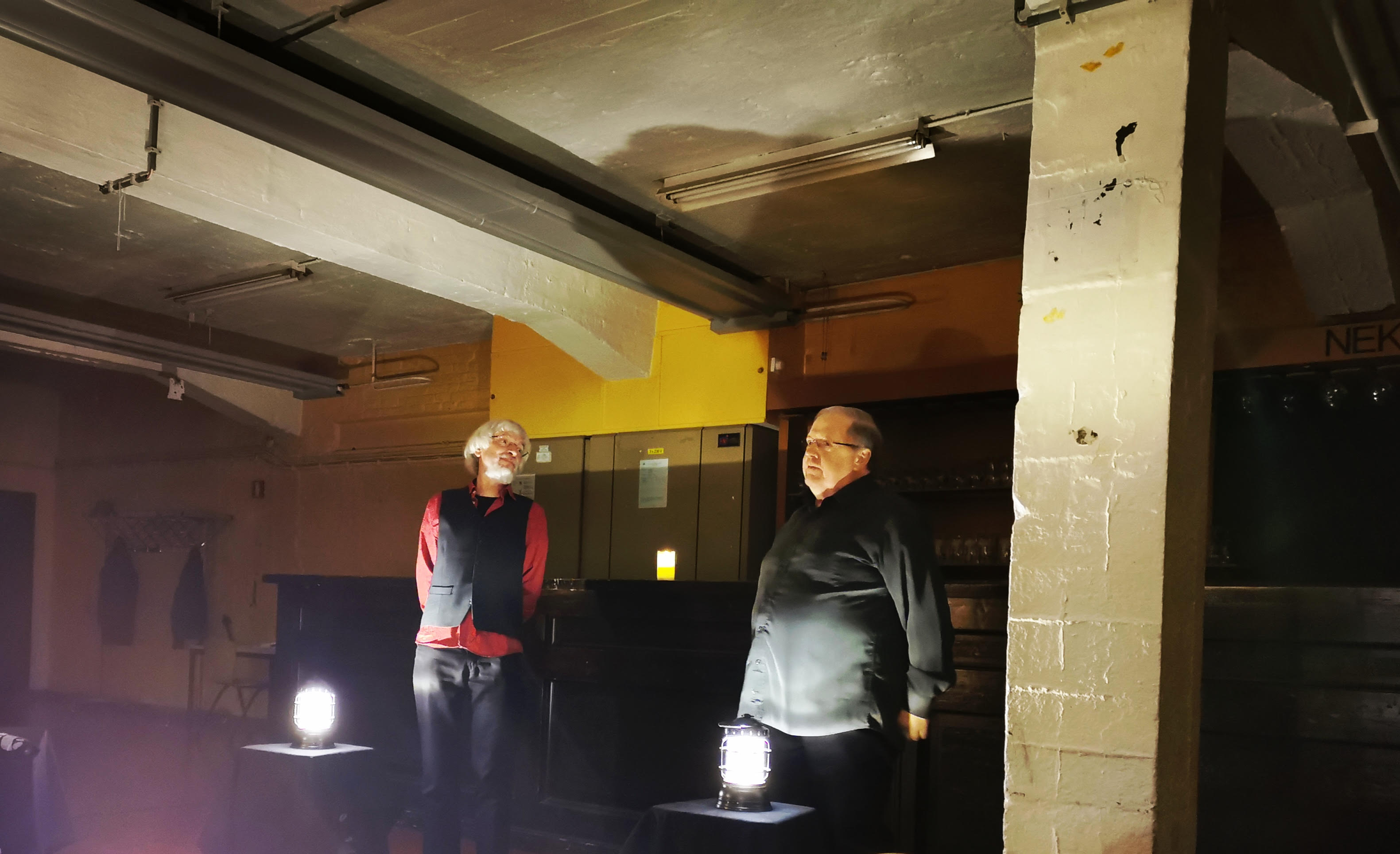 Alleen flauw flikkerend kaarslicht en fluisterende stemmen in de duisternis.